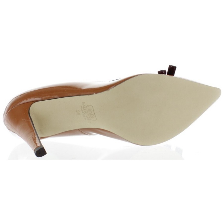 Made out of brown patent leather and decorated with a bow