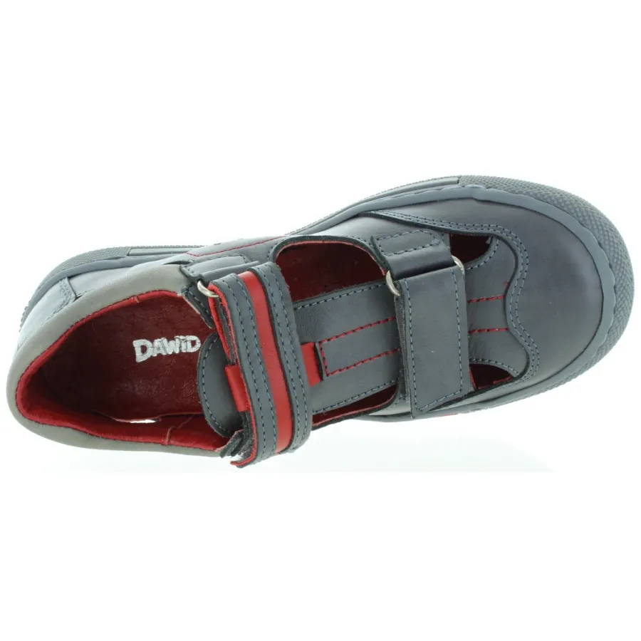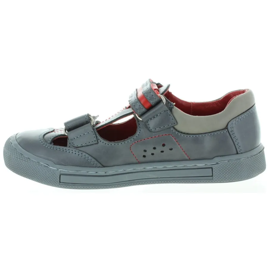 Charcoal,red,gray leather mix closed heel sandals.