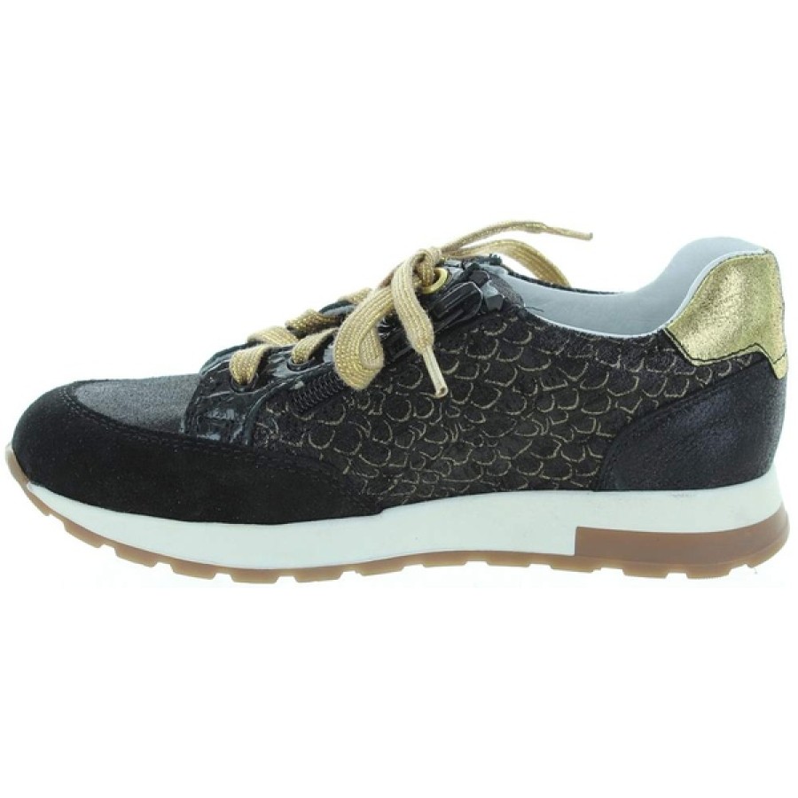 Those sneakers are absolutely lovely they are black leather with gold trim.