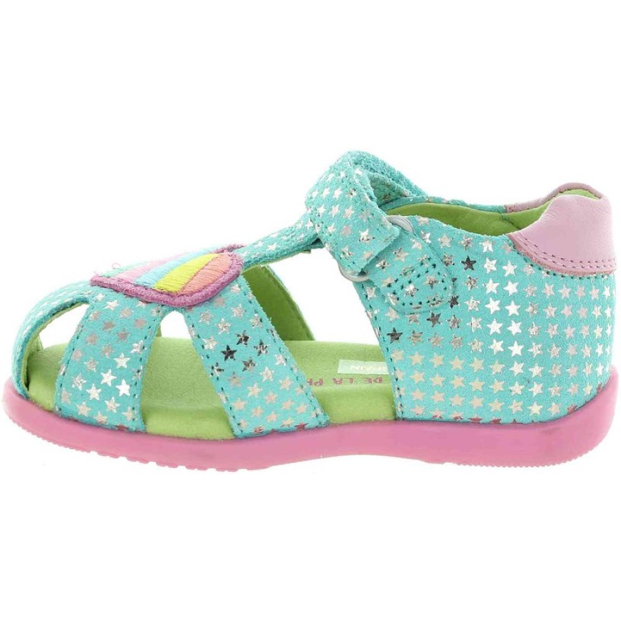 Festive and colorful girls leather blue sandals decorated with rainbow heart.