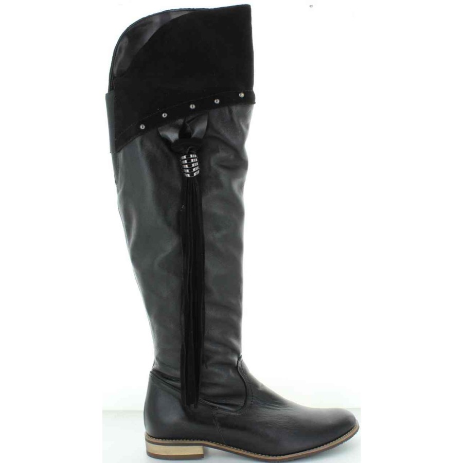 Tall black leather boots that stretch over the knees.